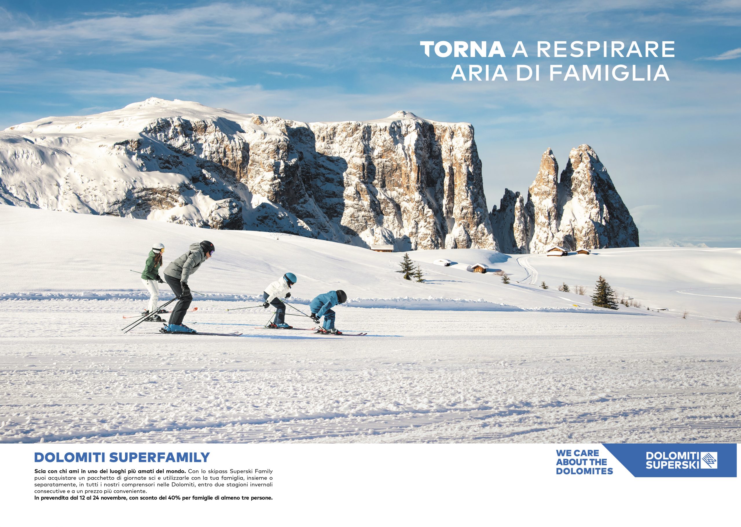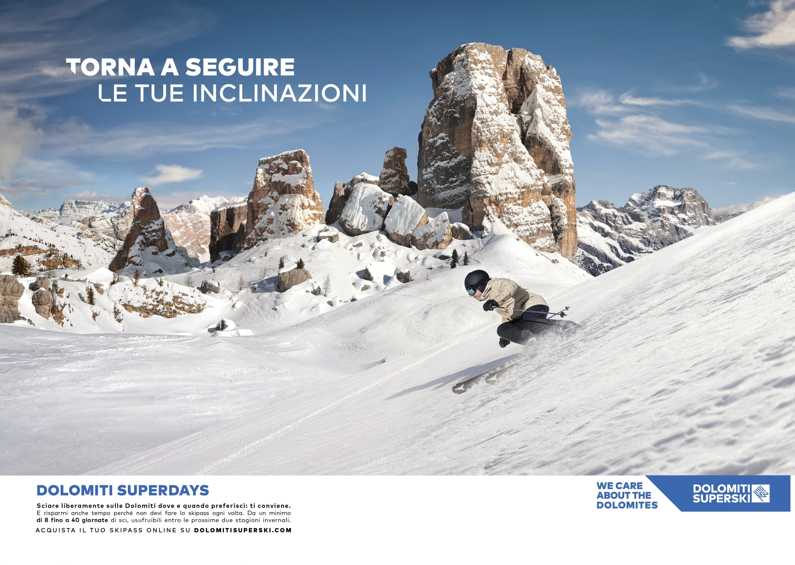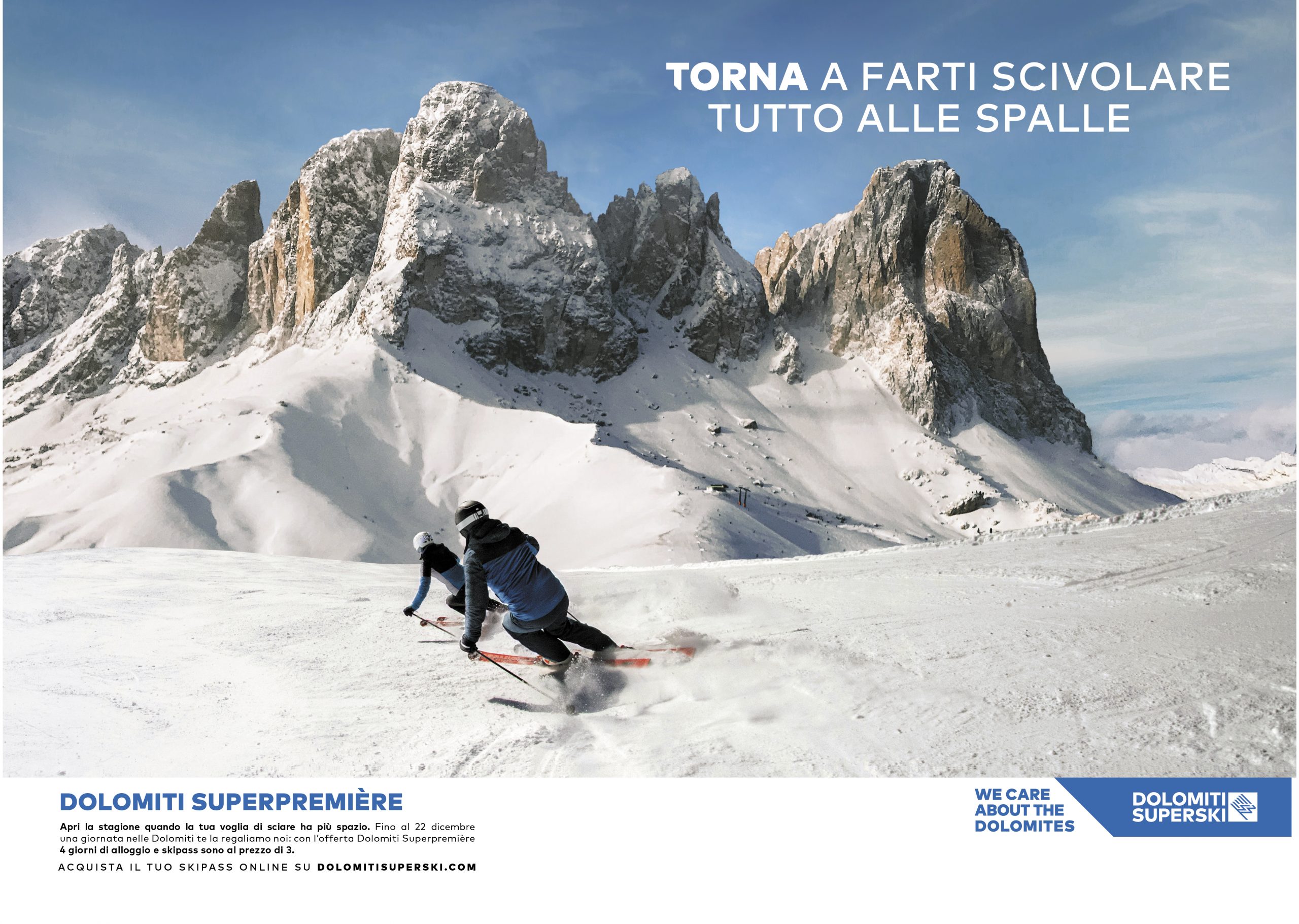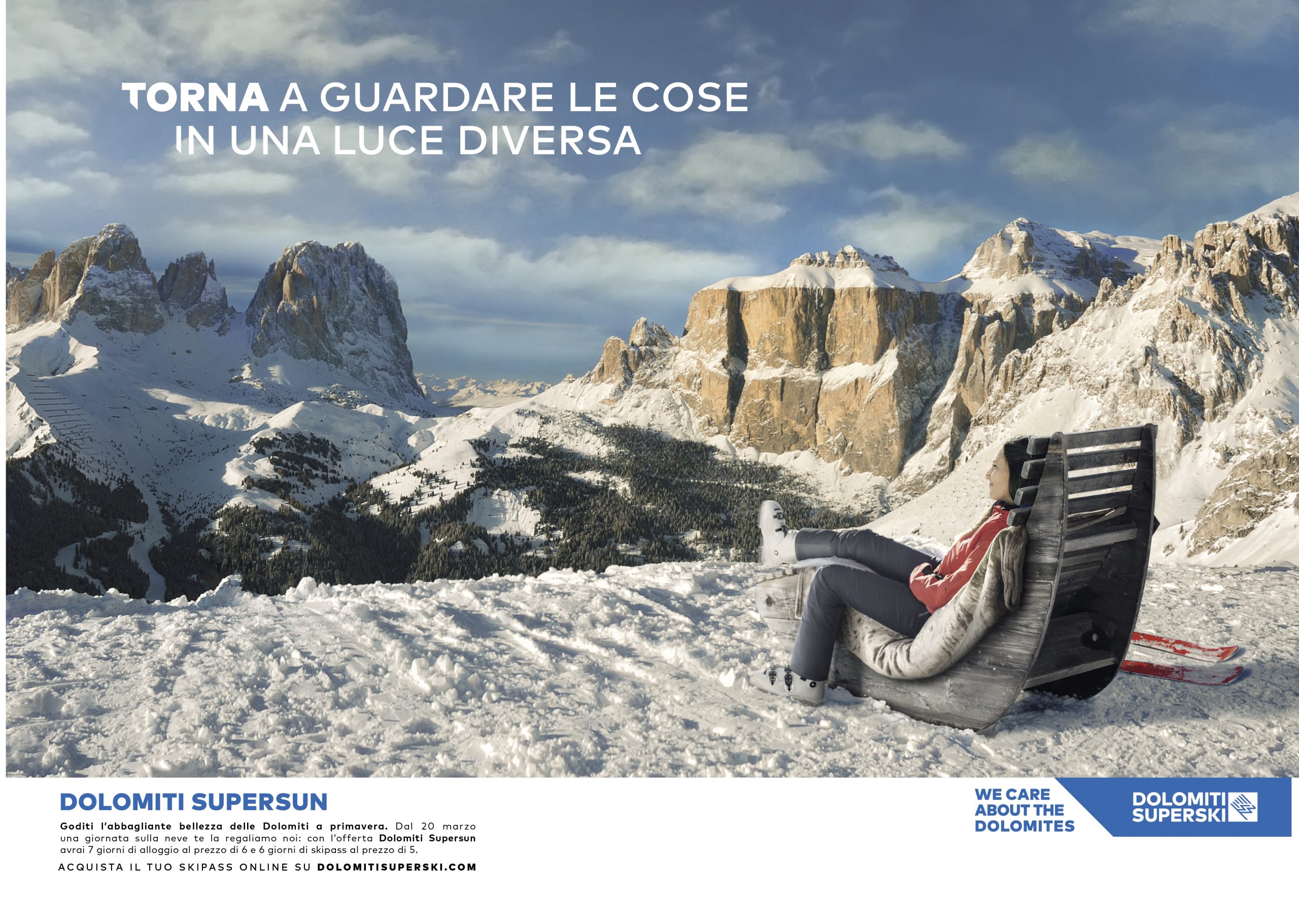 Dopo l’annuncio e lo spot di apertura della stagione invernale, la campagna stampa si articola negli annunci a supporto dei pacchetti promozionali. Le parole valorizzano il significato di immagini dolomitiche affascinanti e incisive, mentre le offerte economiche diventano lo spunto per promesse che vanno oltre il risparmio e lo sport, per farsi invito a rivivere esperienze importanti e uniche dal punto di vista esistenziale.