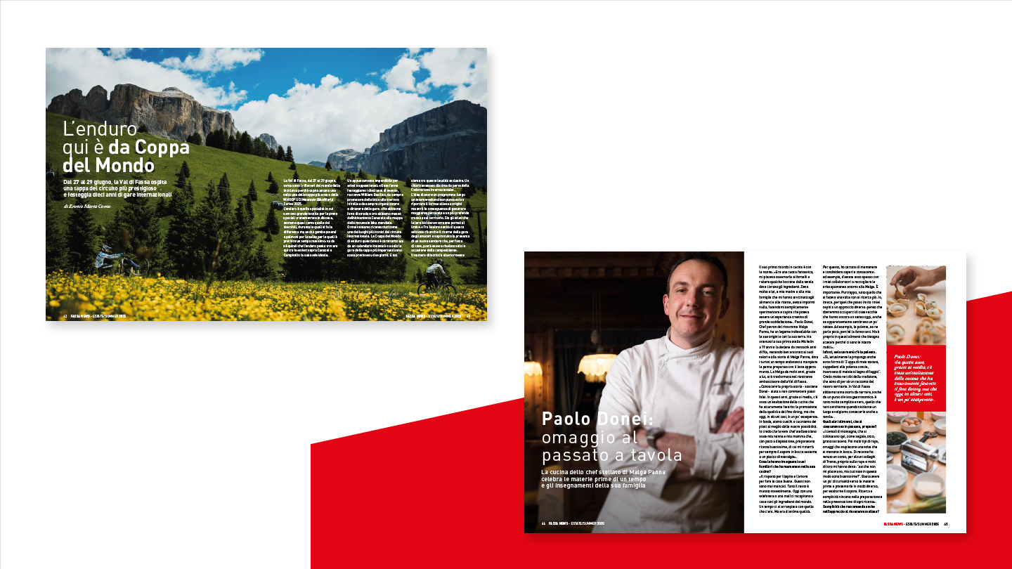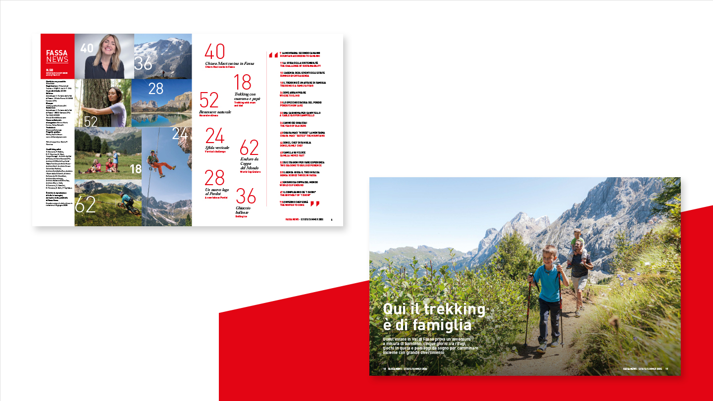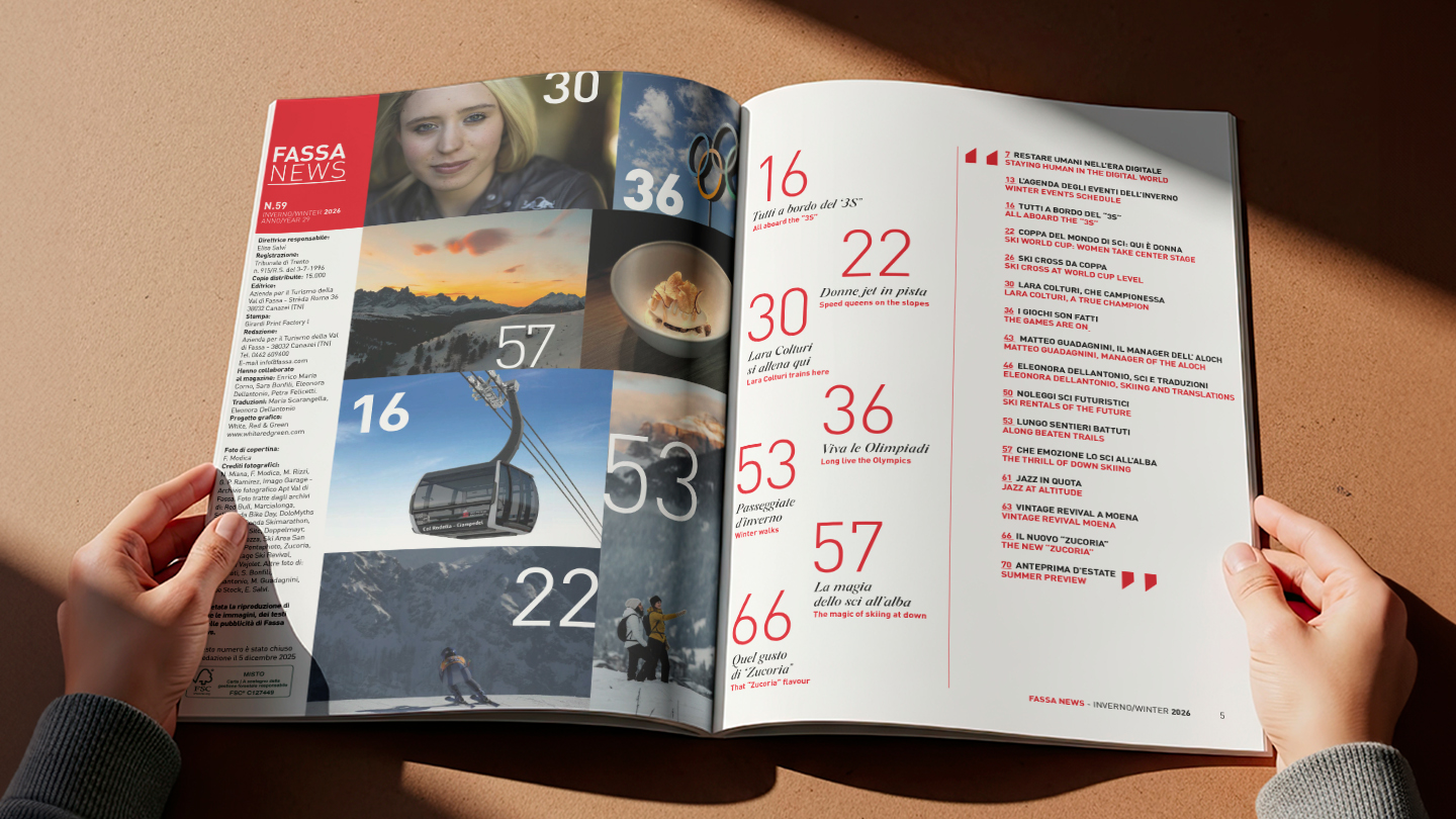 La rivista, perfettamente in linea con l’immagine coordinata sviluppata per il brand, è stata concepita come strumento editoriale capace di raccontare la Val di Fassa in maniera autentica e coinvolgente. Non è solo un contenitore di prodotti, ma un veicolo di valori, cultura e ispirazione, pensato per creare una connessione diretta con i lettori e rafforzare la brand identity.