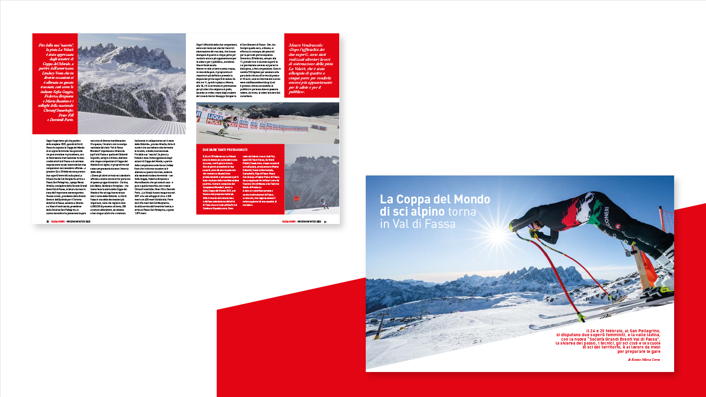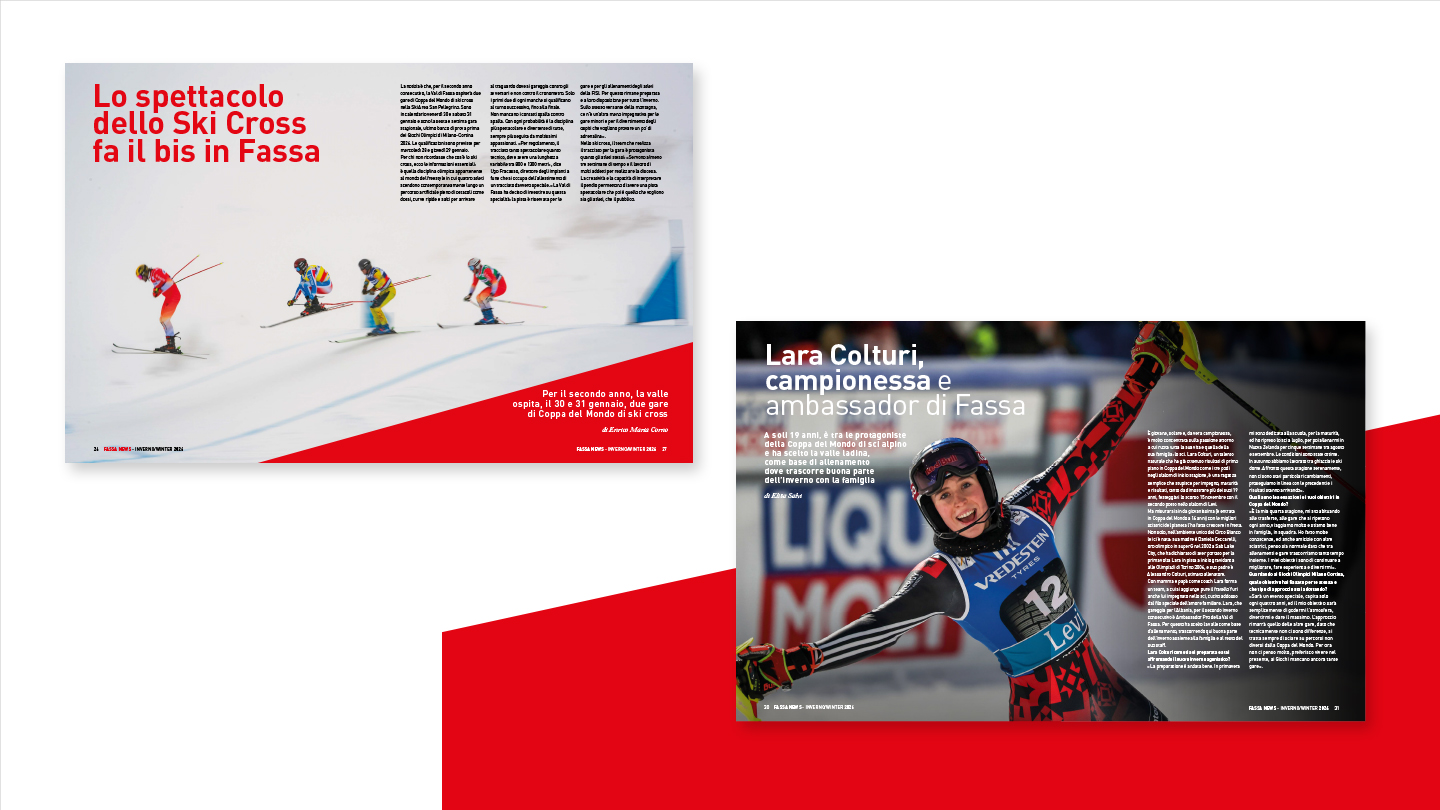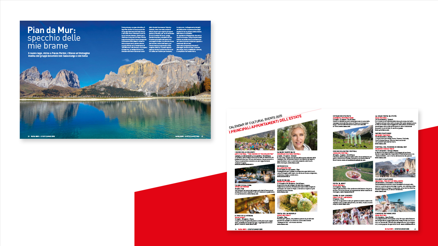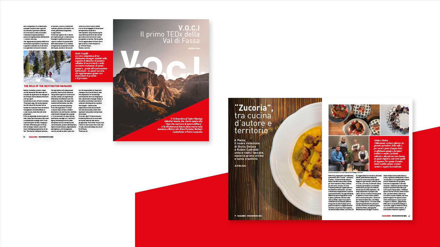 La rivista, perfettamente in linea con l’immagine coordinata sviluppata per il brand, è stata concepita come strumento editoriale capace di raccontare la Val di Fassa in maniera autentica e coinvolgente. Non è solo un contenitore di prodotti, ma un veicolo di valori, cultura e ispirazione, pensato per creare una connessione diretta con i lettori e rafforzare la brand identity.