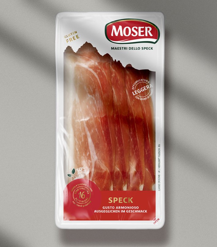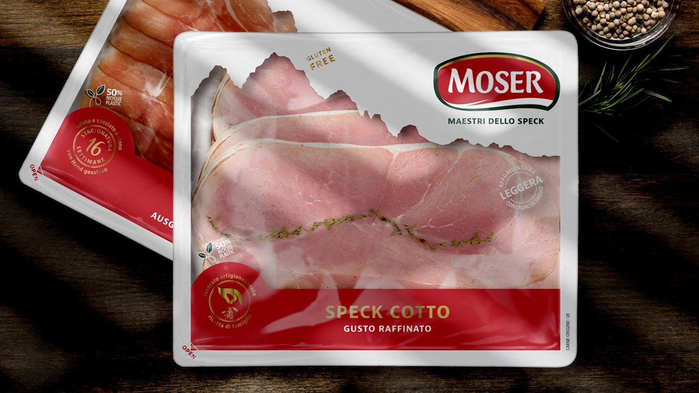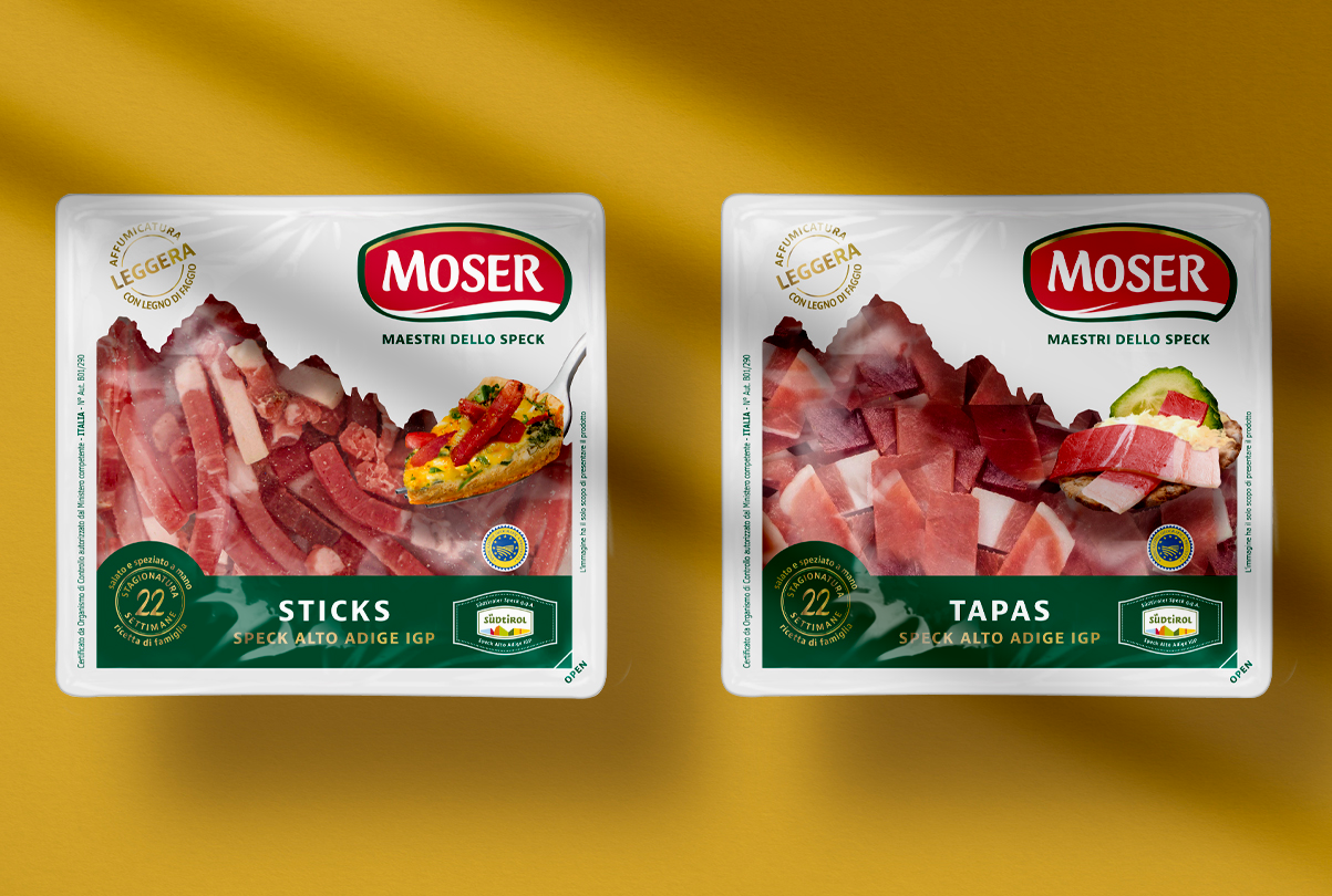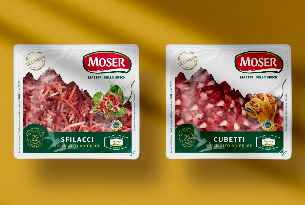 Moser, brand leader nella produzione di speck di alta qualità, da oltre 50 anni è un marchio affidabile, vicino al consumatore e con un forte appeal per target giovani e non. Per rafforzarne il posizionamento e veicolare i concetti di piacere, bontà ed eccellenza, è stato sviluppato un restyling dei packaging che ha puntato sulla contemporaneità e sulla valorizzazione delle singole linee di prodotto.