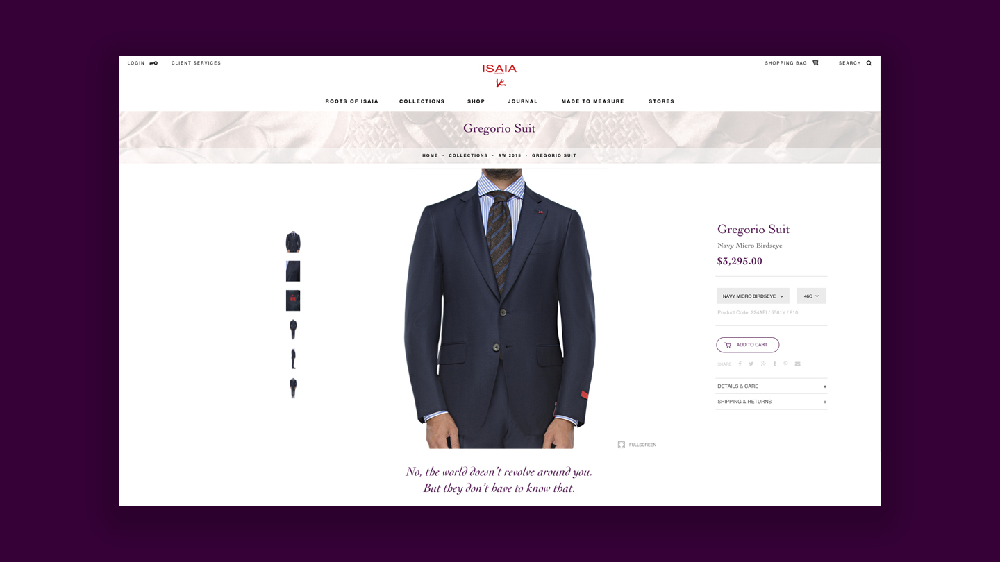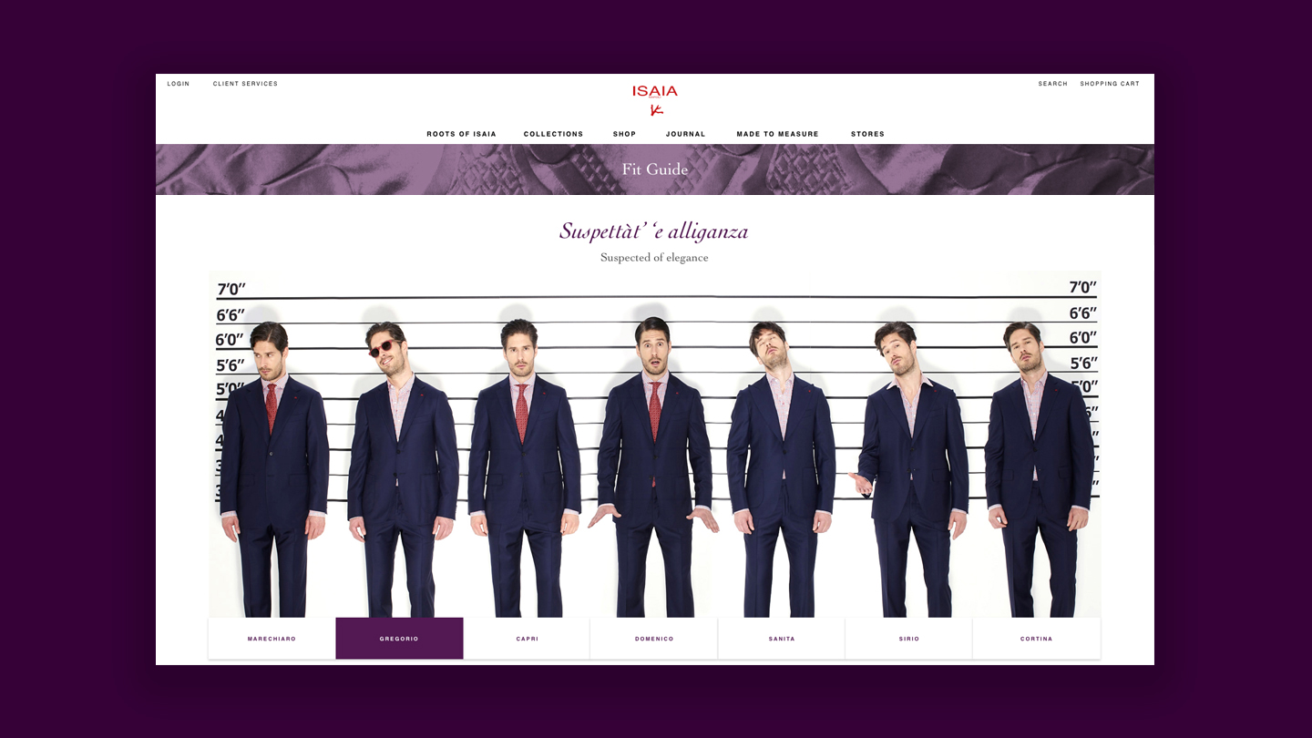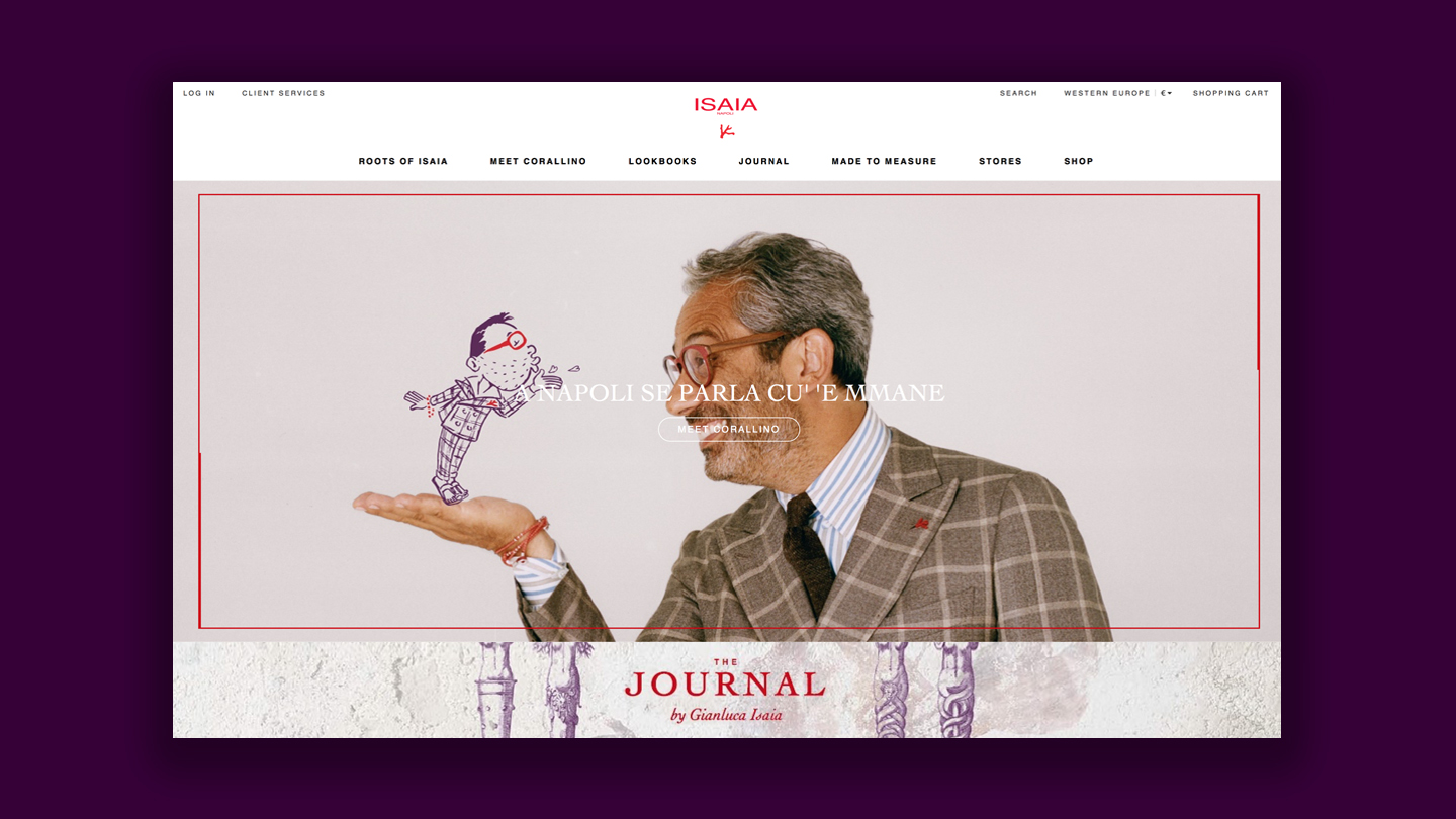 Le sue radici affondano nella tradizionale sartoria napoletana, il suo animo è contemporaneo e irriverente, quello di un dandy moderno. Per ISAIA, White, Red & Green ha realizzato un sito che dà spazio a tutto questo: i lookbook, l’e-commerce delle collezioni, il journal di Gianluca Isaia e il geniale Corallino© che insegna il linguaggio dei gesti tipici napoletani.