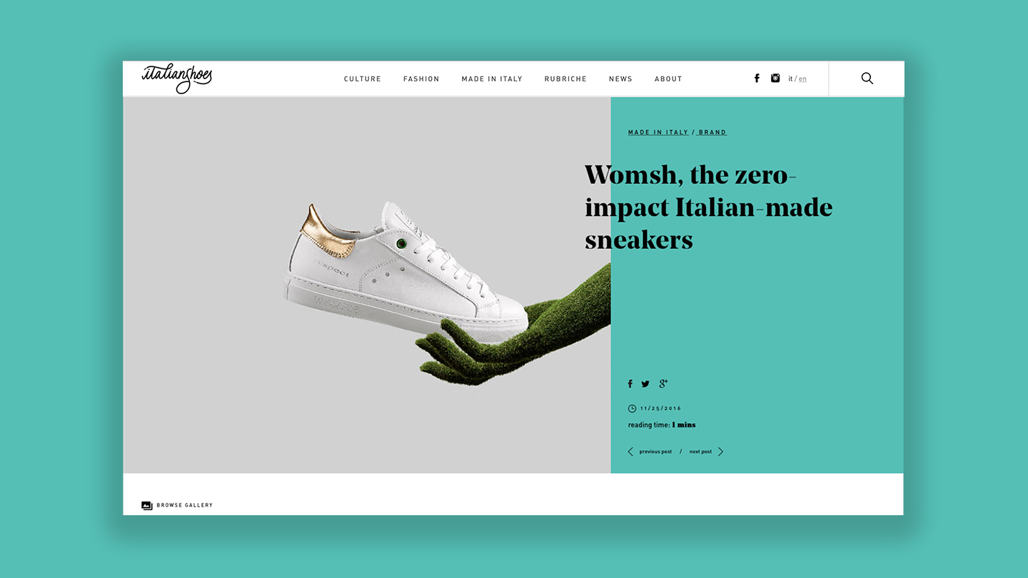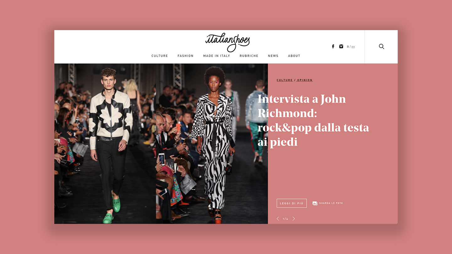 Per celebrarla con storie sempre nuove e seguirla dalla produzione alle passerelle, dall’artigianato all’innovazione, Assocalzaturifici lancia Italian Shoes, una piattaforma di comunicazione digitale, e una pagina Facebook, che fa cultura sulla scarpa italiana e la porta, ancora una volta, in tutto il mondo. White, Red & Green ha curato progettazione, sviluppo sito e contenuti.
