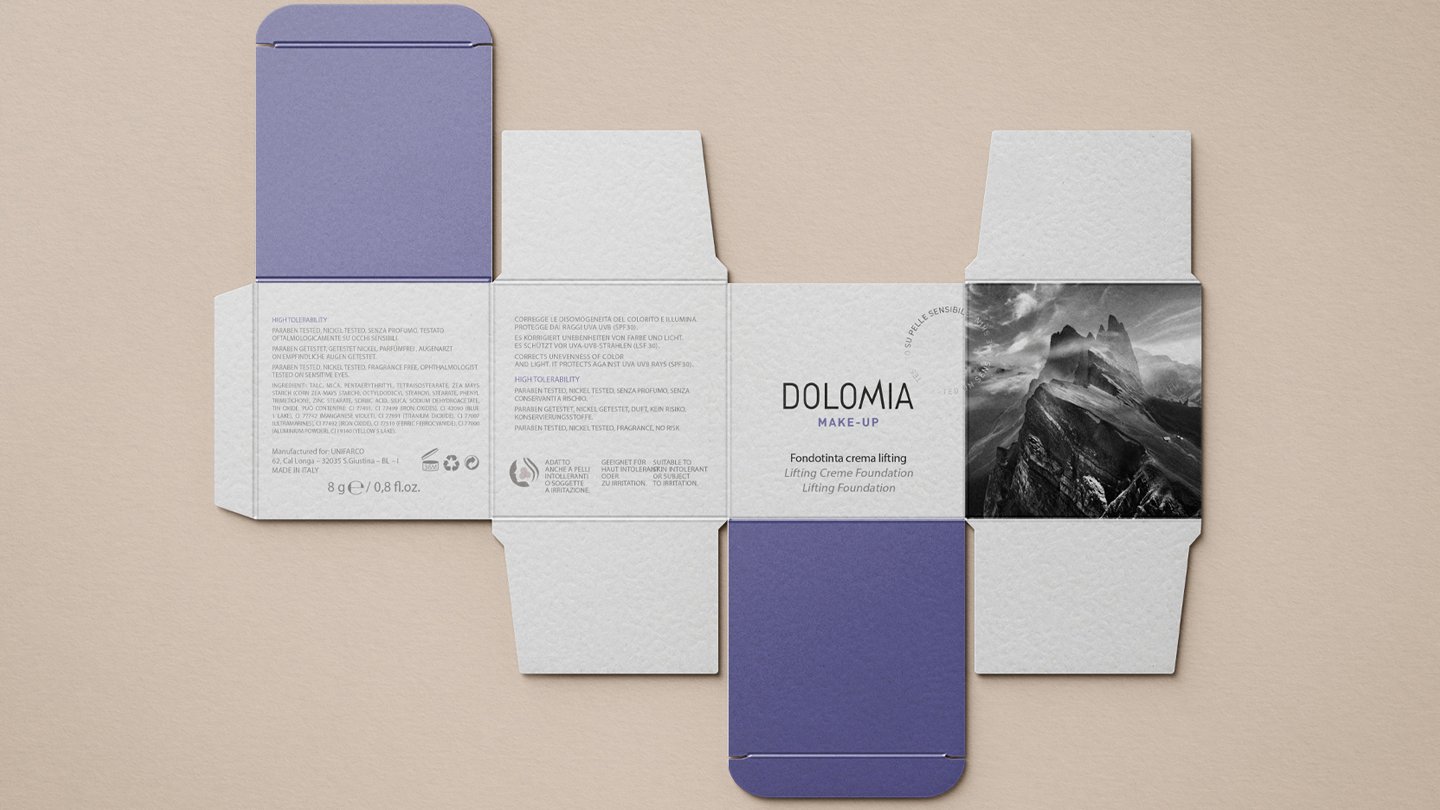 Dolomia, marchio del gruppo Unifarco, azienda bellunese con sede nel comprensorio delle Dolomiti, ha scelto White, Red & Green per il progetto di rilancio delle linee make-up e cosmesi, dedicate al canale farmaceutico. Dopo la rivisitazione del logotipo Dolomia con uno stile più attuale e legato al mondo beauty, dove la “M” diventa l’elemento caratterizzante legato alle Dolomiti, l’agenzia ha progettato il nuovo packaging della linea make-up.