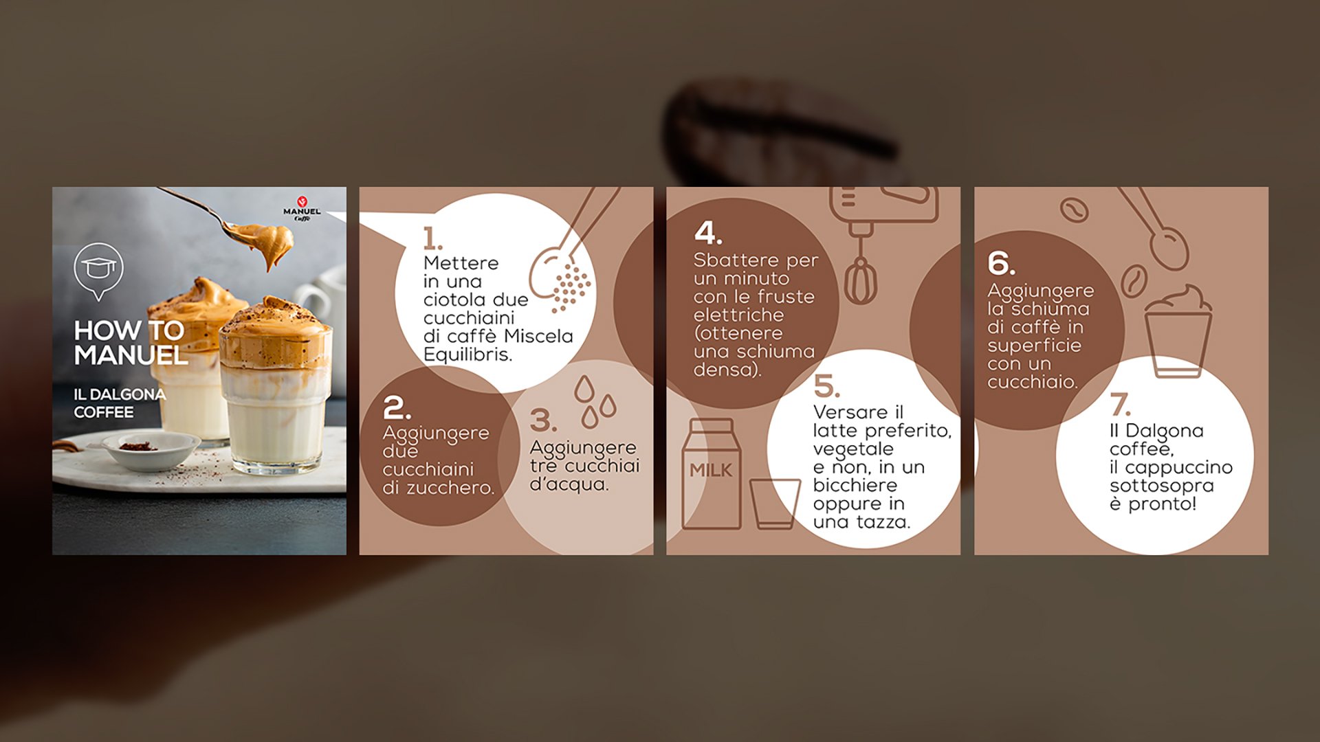 Ne deriva un feed curato nell’estetica, composto da numerosi format tra post statici, carousel e video che attira l’utente e lo conduce dentro l’universo del caffè Manuel, dalla pianta alla tazza.