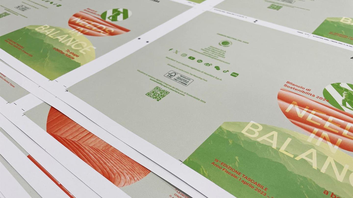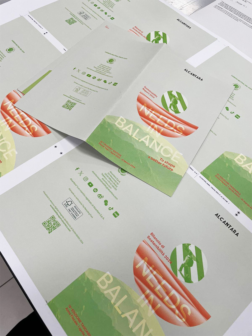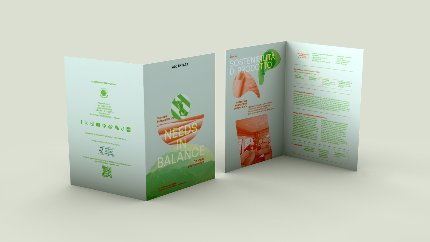 Alcantara risponde alla necessità di equilibrio valorizzando le proprie risorse e portando avanti una visione innovativa e responsabile. Il bilanciamento tra bisogni e priorità si declina pagina dopo pagina attraverso scelte grafiche impattanti, forme e geometrie perfettamente simmetriche, linee moderne, cromie che richiamano i toni del verde in tutte le sue sfumature.