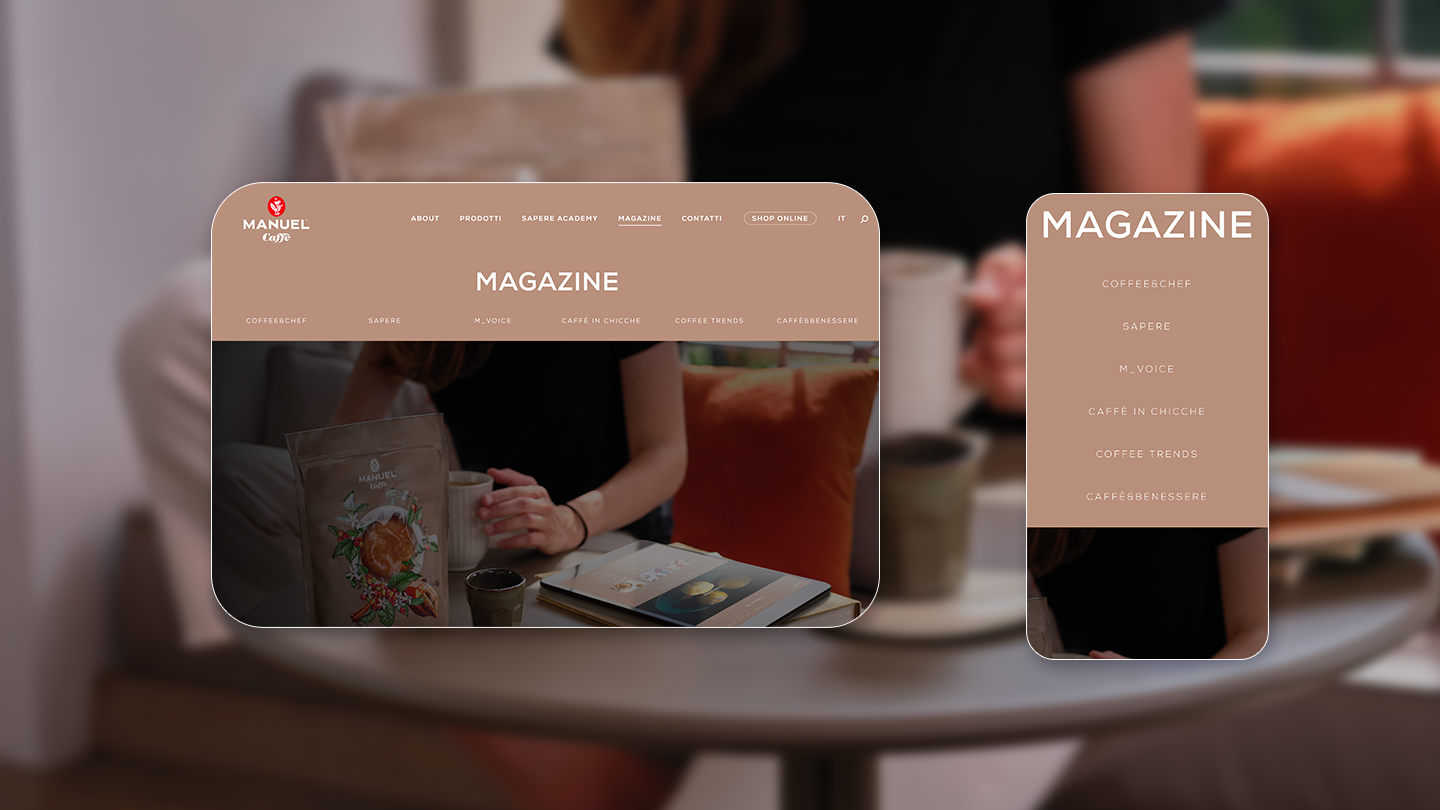La struttura del sito offre una navigazione fluida e intuitiva, con percorsi chiari sia per il pubblico professionale (baristi, distributori, operatori Ho.Re.Ca.) sia per il consumatore finale. Per rafforzare la brand reputation sono presenti sezioni educational dedicate alla “Sapere Academy”, la coffee school Manuel Caffè, un magazine con contenuti ingaggianti sul mondo del caffè e un e-shop progettato per essere facilmente accessibile fin dalla homepage, con un’interfaccia semplice e mobile-first, per facilitare l’acquisto e aumentare la conversione.