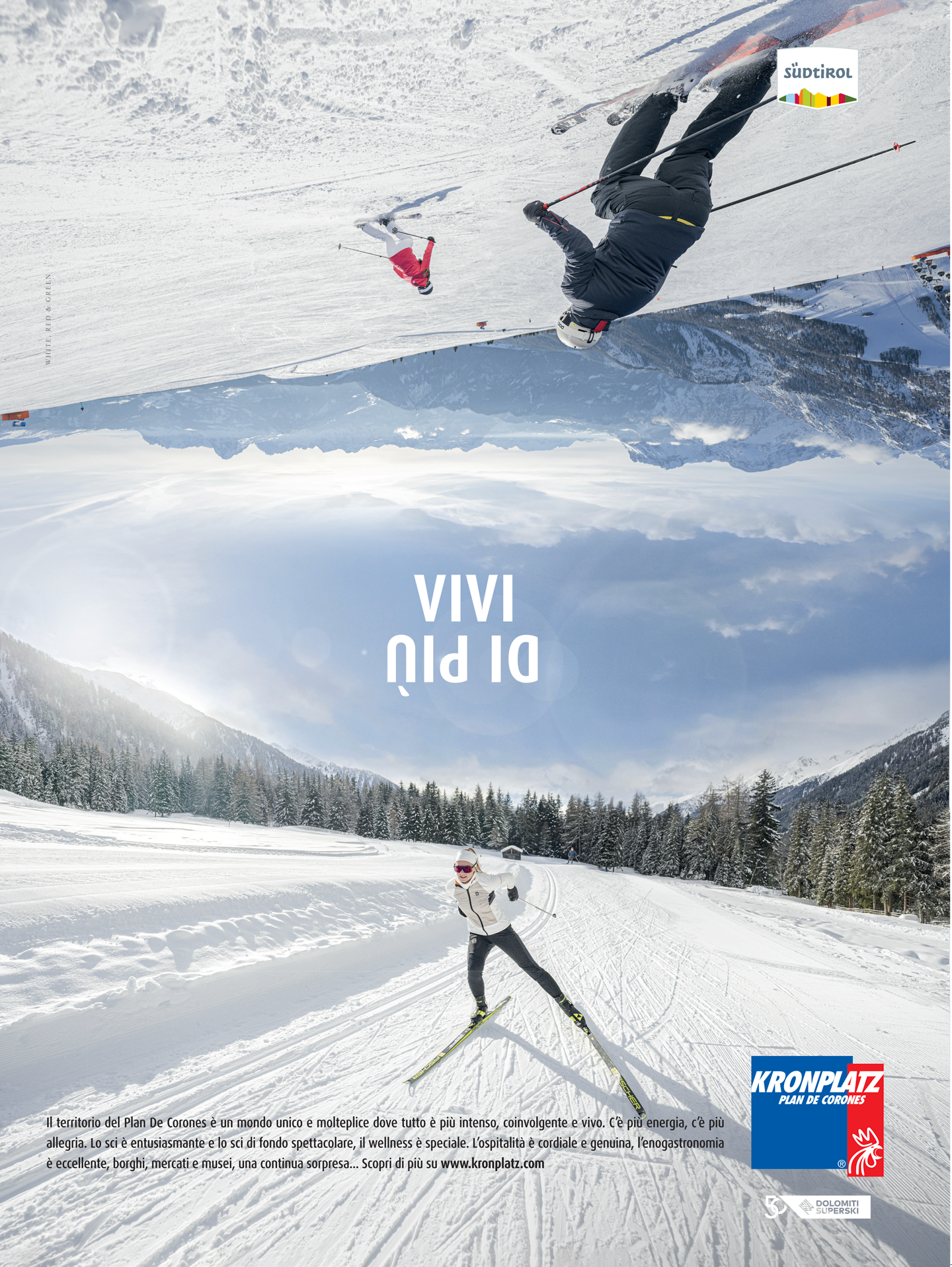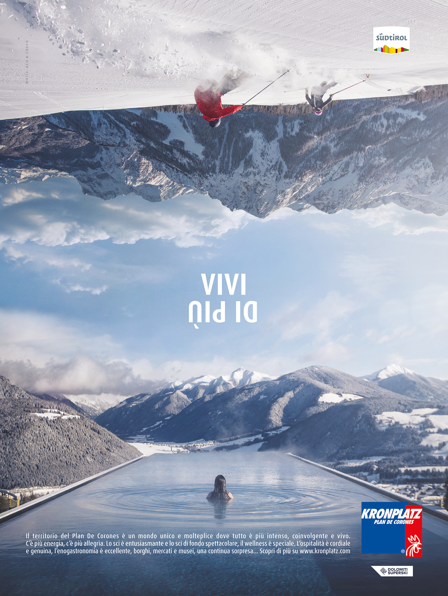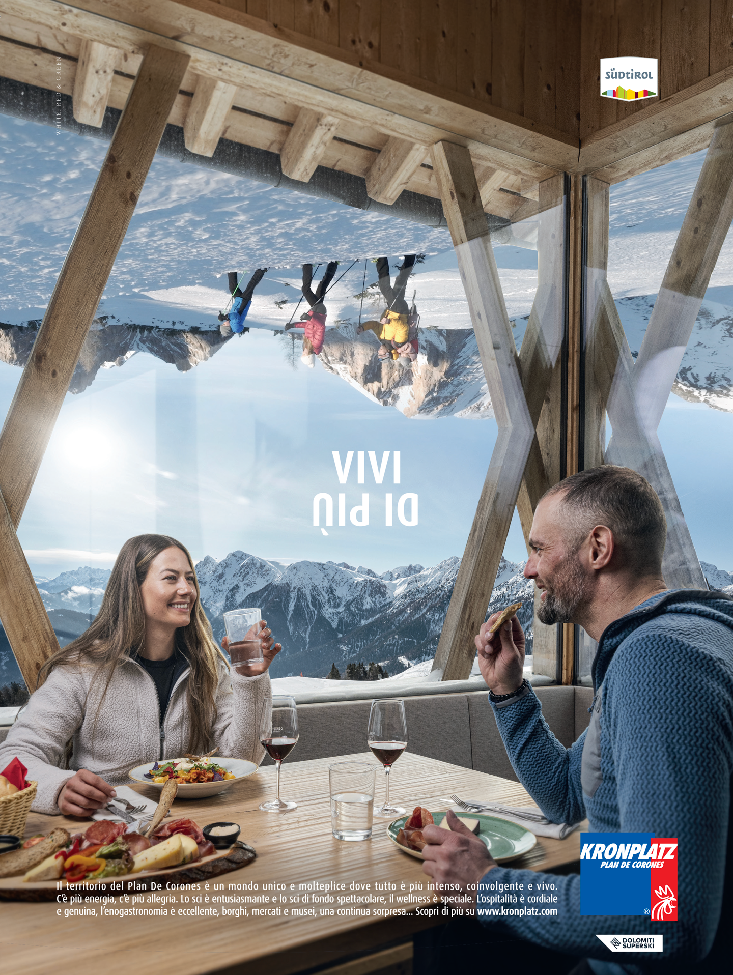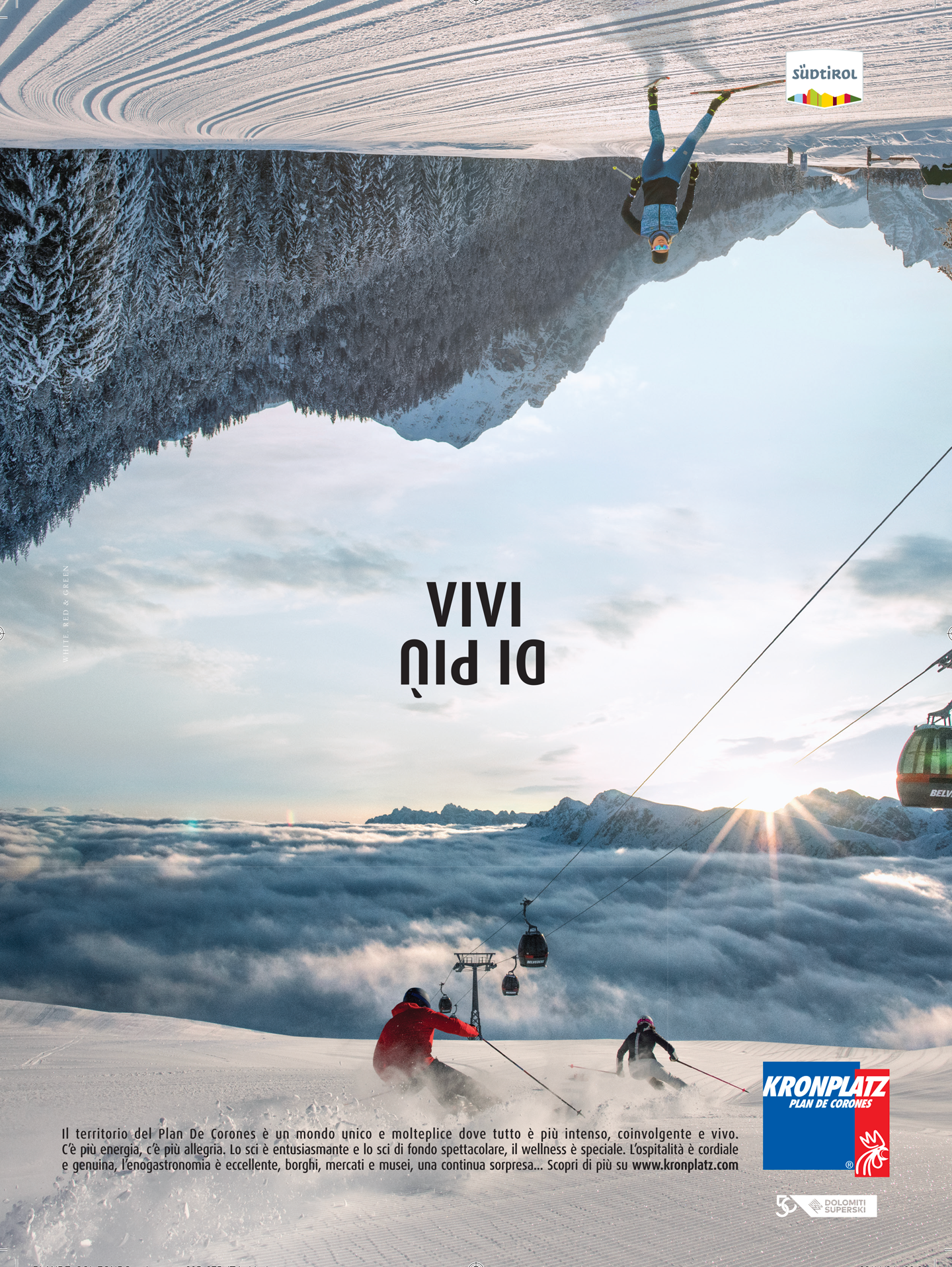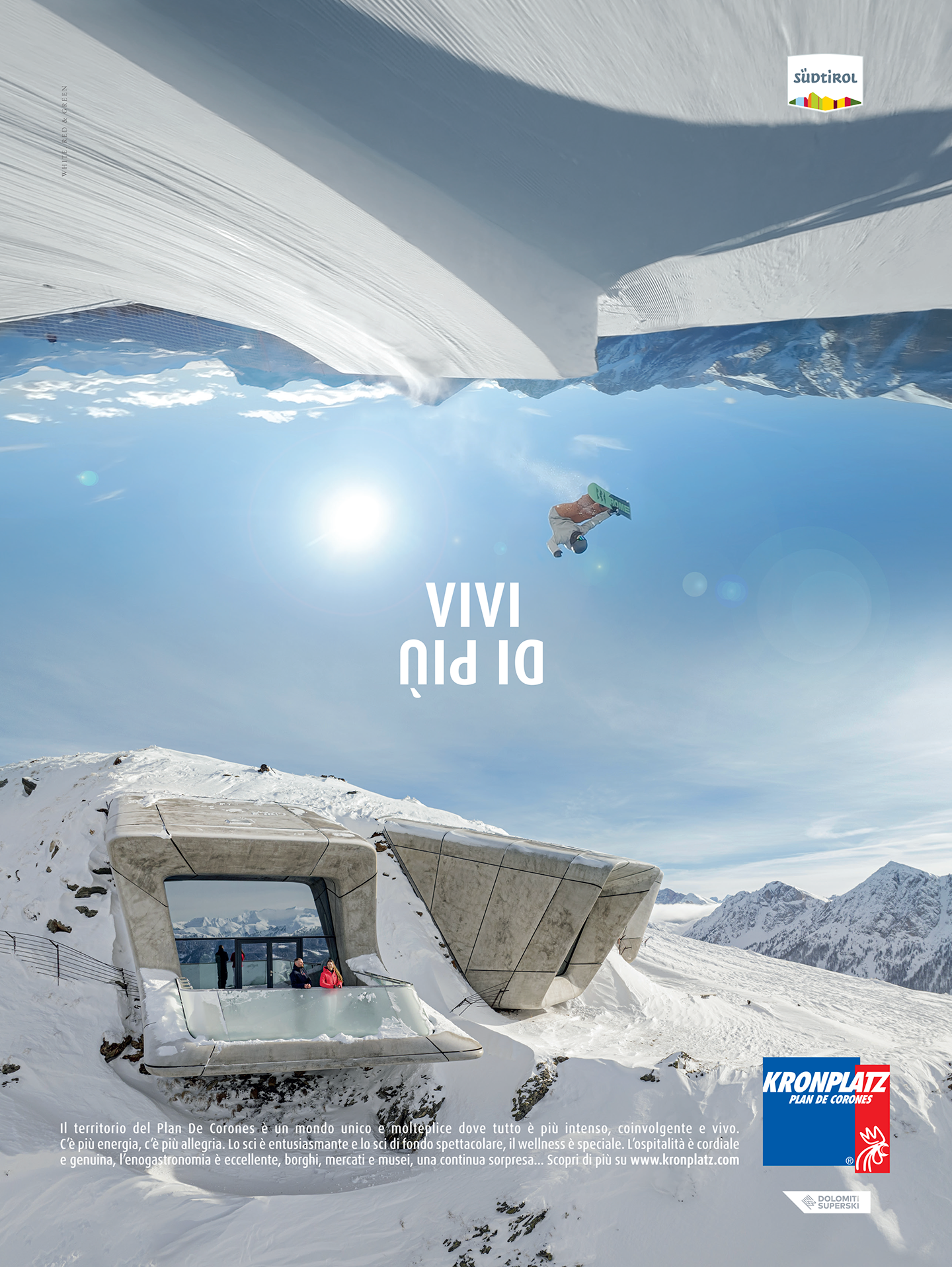 La grande offerta di Plan de Corones in termini di varietà è stata rappresentata con un trattamento visionario di grande impatto che veicola “doppi mondi”, dove si svolgono attività diverse. Un key visual, declinabile su tutti i media, che permette di comunicare la straordinaria ricchezza dell’offerta Plan de Corones come vantaggio competitivo rispetto alle altre destinazioni di montagna. La headline sottolinea in modo chiaro e diretto il posizionamento: “Plan de Corones. Vivi di più”.