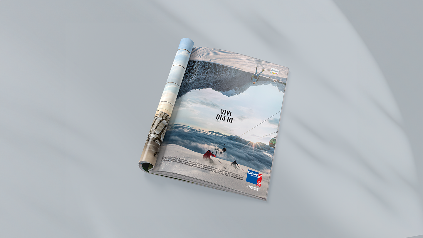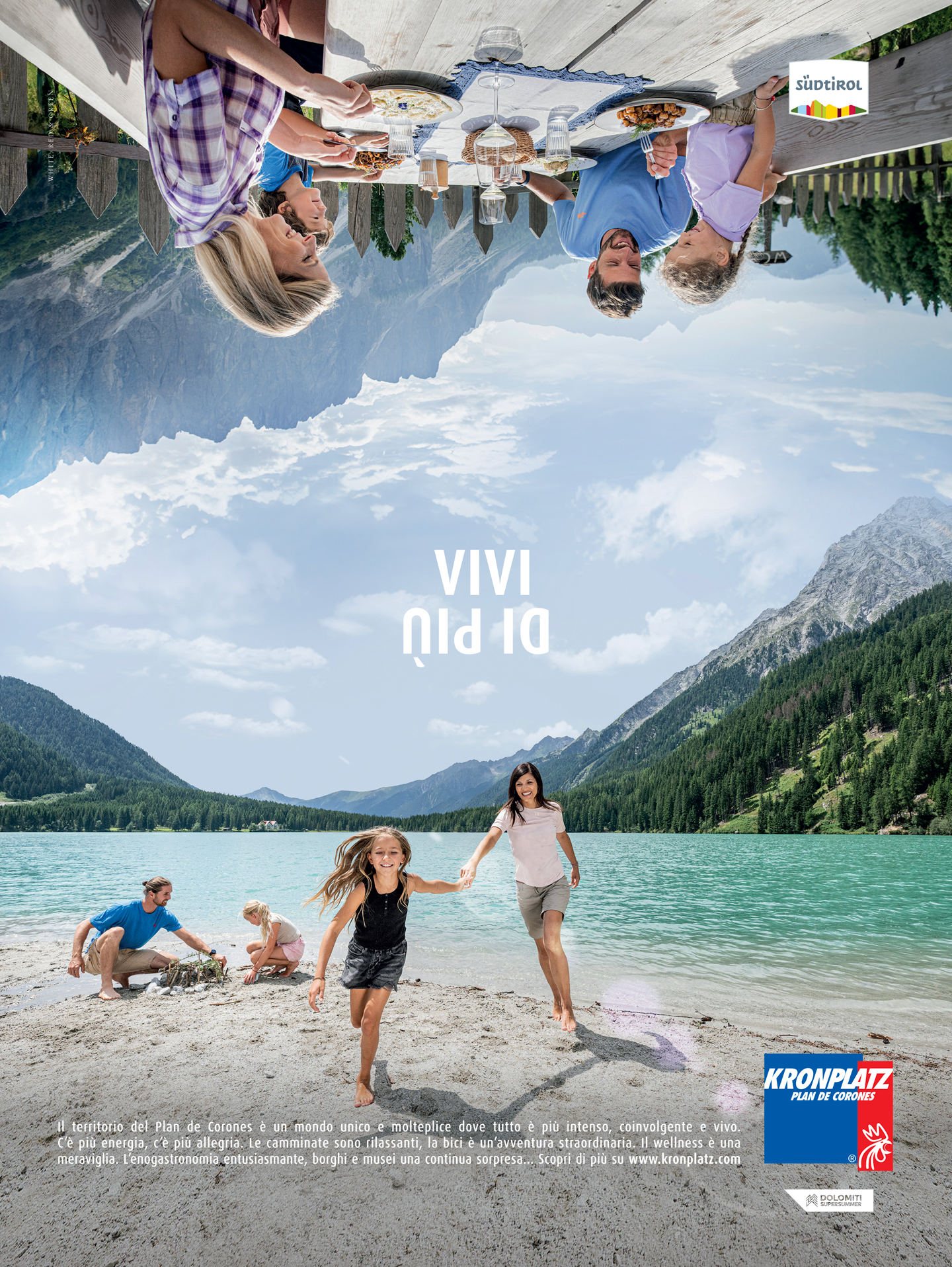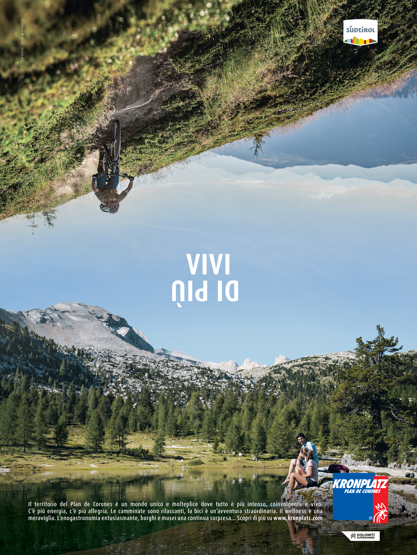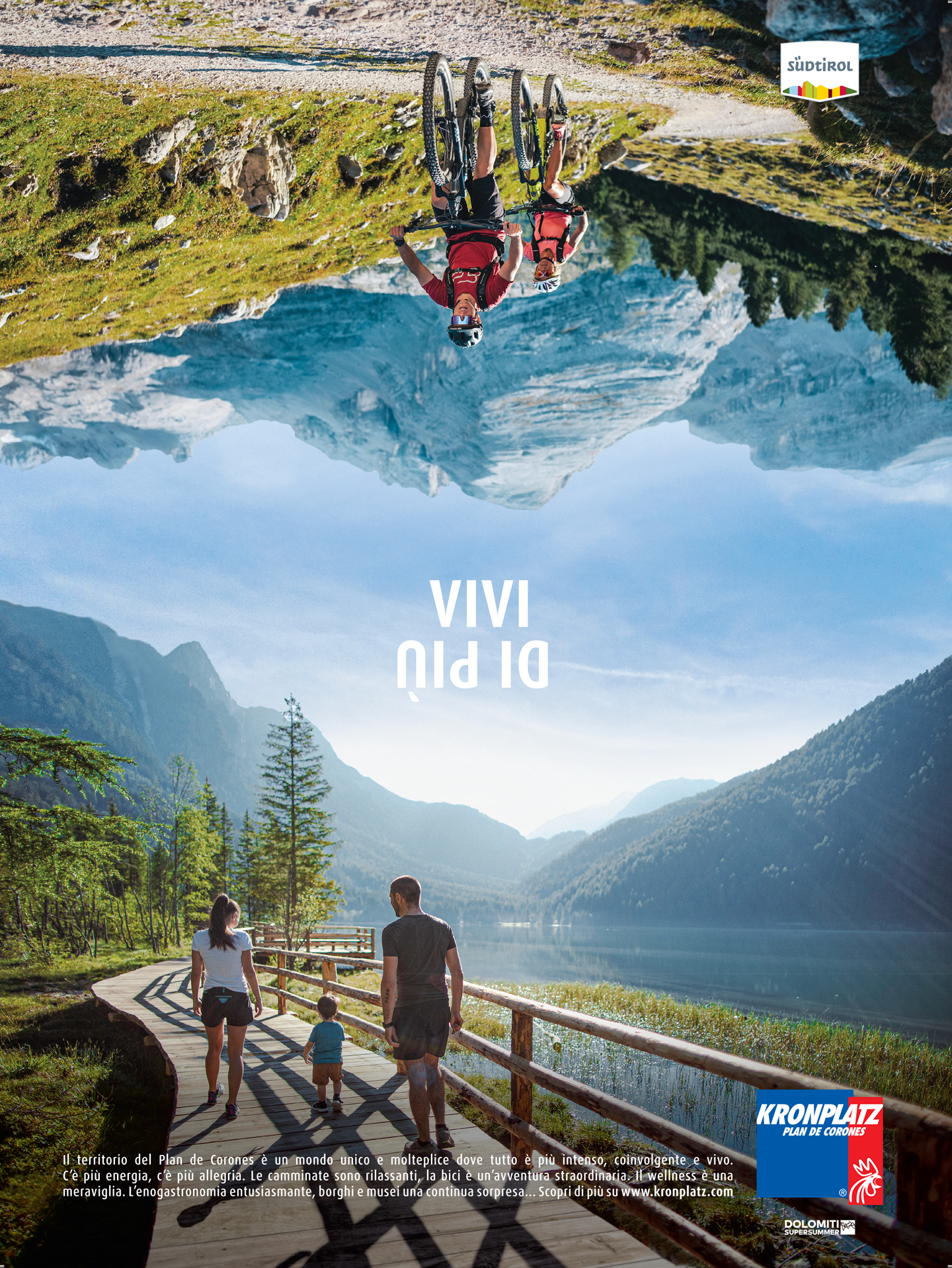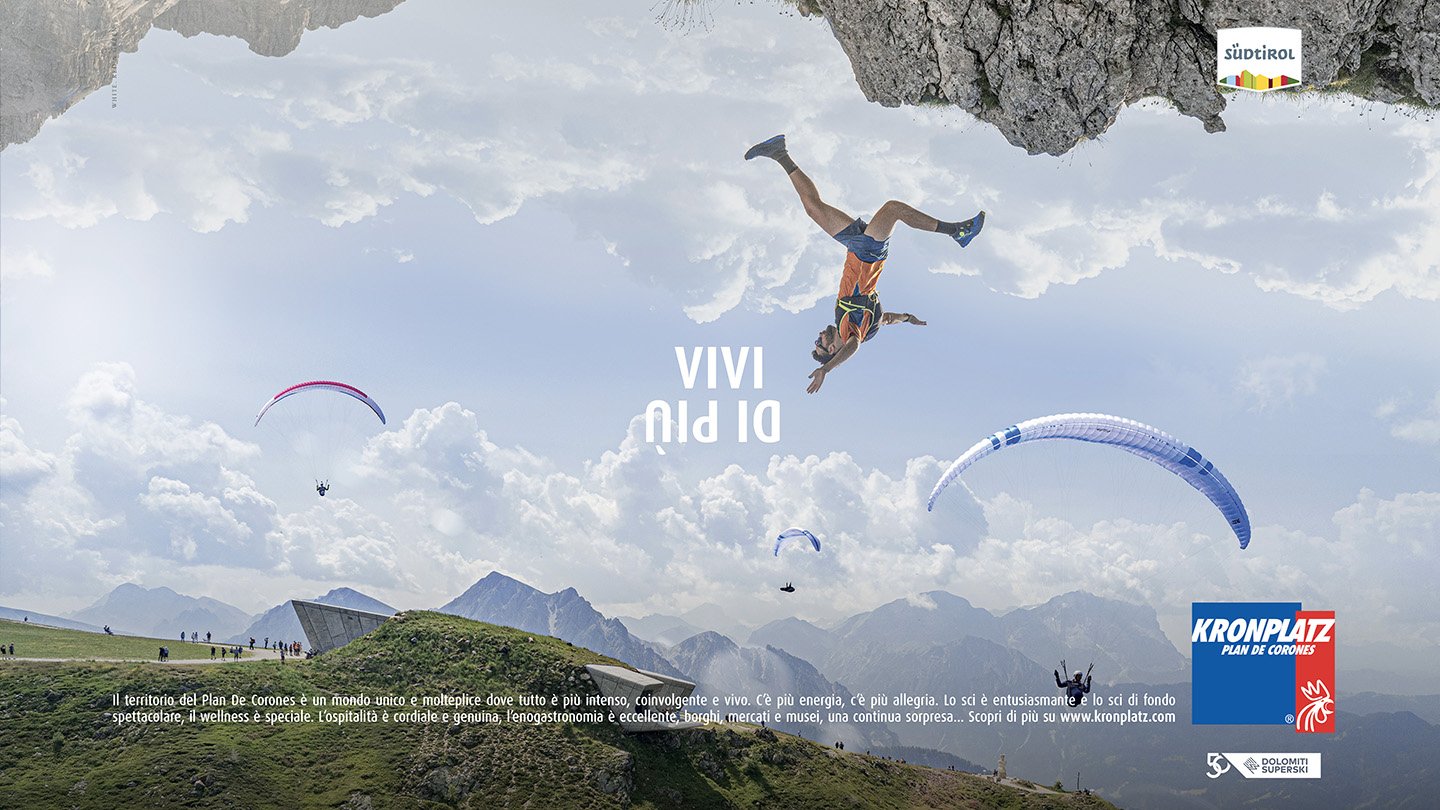 La grande offerta di Plan de Corones in termini di varietà è stata rappresentata con un trattamento visionario di grande impatto che veicola “doppi mondi”, dove si svolgono attività diverse. Un key visual, declinabile su tutti i media, che permette di comunicare la straordinaria ricchezza dell’offerta Plan de Corones come vantaggio competitivo rispetto alle altre destinazioni di montagna. La headline sottolinea in modo chiaro e diretto il posizionamento: “Plan de Corones. Vivi di più”.