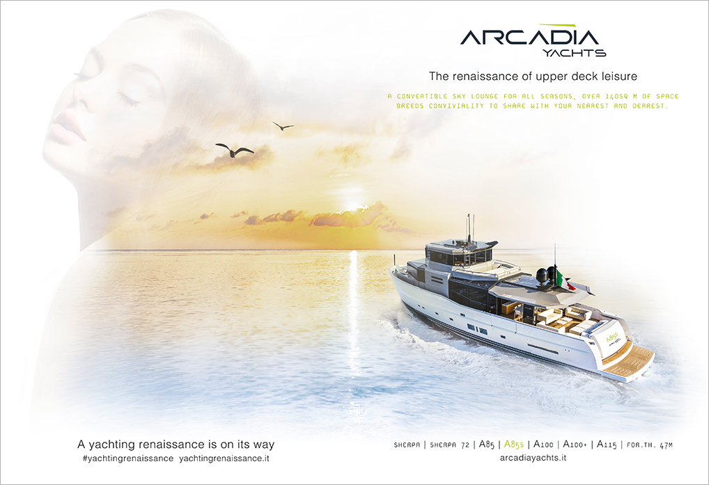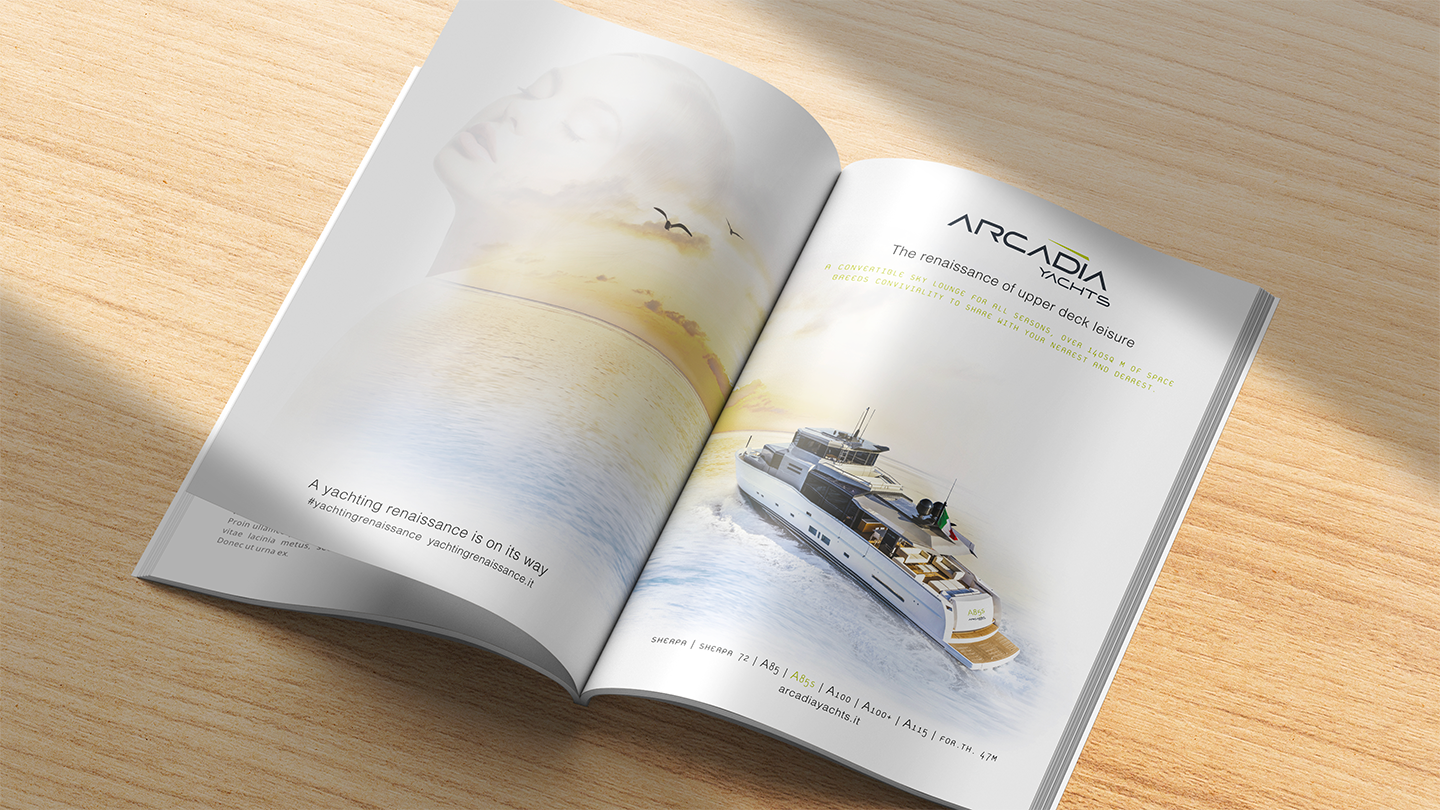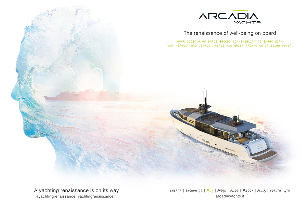 Dal golfo di Sorrento ha inizio un viaggio che vede protagonista Arcadia, azienda dall’animo innovativo e rivoluzionario, qui White, Red & Green ha creato Yachting Renaissance, un progetto creativo immaginifico: il racconto del sogno di un armatore attraverso una campagna multi soggetto, lanciato in occasione dello Yachting Festival di Cannes, evento chiave della nautica.